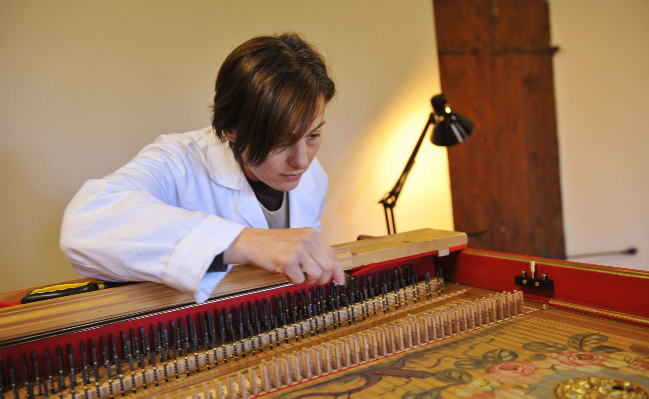 The visit continues in the ateliers where it is possible to watch the different steps of the construction of the harpsichord, from the sound box to the decoration, from the stringing to the voicing. By meeting the luthiers, their materials and equipment it is possible to learn the main principles of the sound production and understand how musical instruments work.